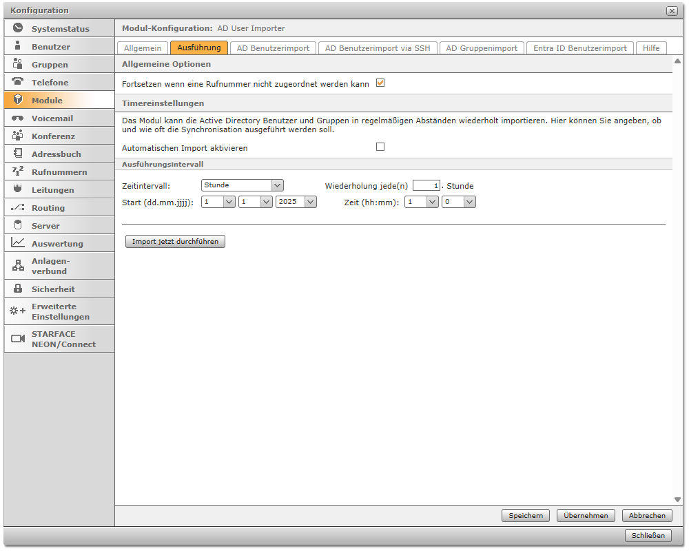 Das Modul kann die Active Directory Benutzer und Gruppen in regelmäßigen Abständen wiederholt importieren. Hier kann angeben werden, ob und wie oft die Synchronisation ausgeführt werden soll.