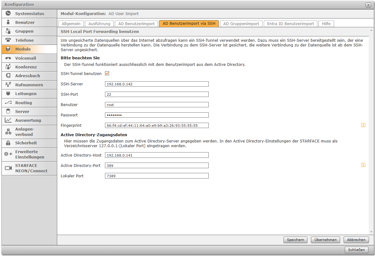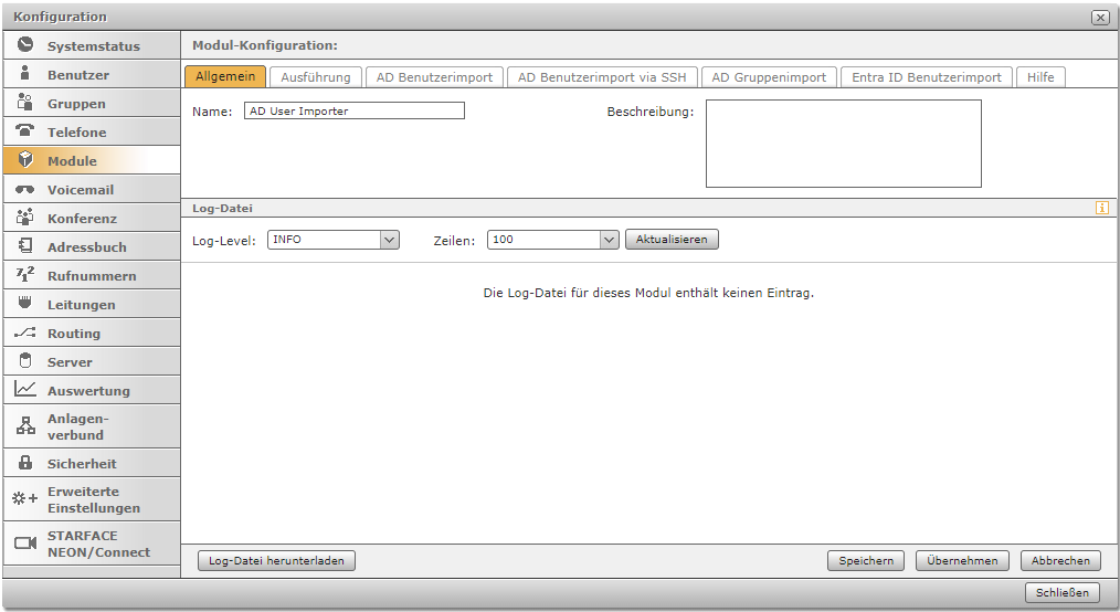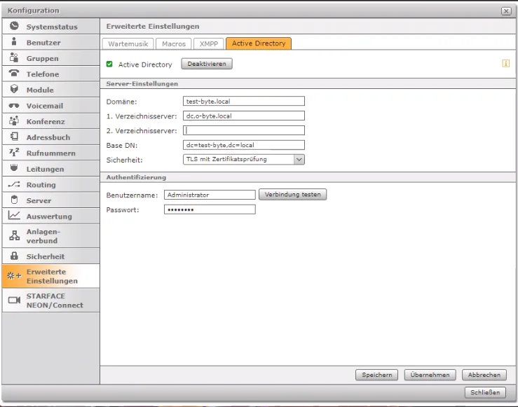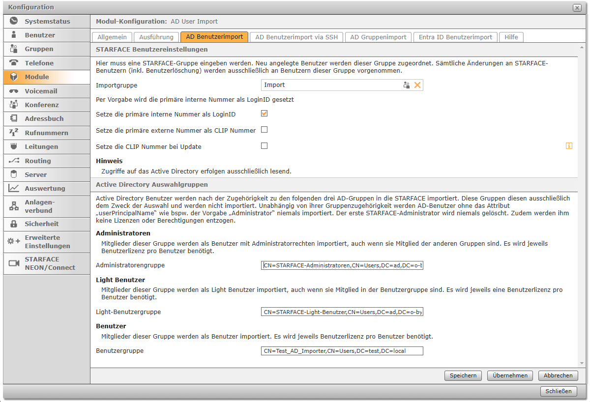 Der AD User Importer nutzt die auf der STARFACE integrierte Anbindung des Active Directory. Diese Anbindung muss vor der Konfiguration des Moduls hergestellt werden. Nähere Infos finden sich in der STARFACE Knowledge Base.