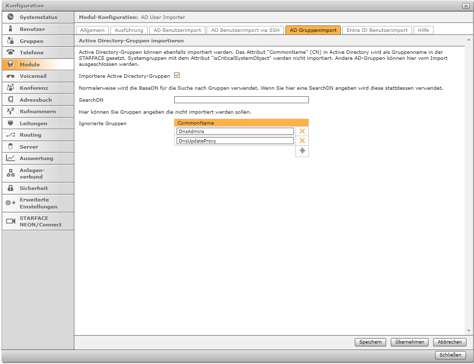 Active Directory-Gruppen können ebenfalls importiert werden. Das Attribut “CommonName” (CN) in Active Directory wird als Gruppenname in der STARFACE gesetzt. Systemgruppen mit dem Attribut “isCriticalSystemObject” werden nicht importiert. Andere AD-Gruppen können hier vom Import ausgeschlossen werden.