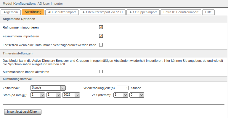 Das Modul kann die Active Directory Benutzer und Gruppen in regelmäßigen Abständen wiederholt importieren. Hier kann angeben werden, ob und wie oft die Synchronisation ausgeführt werden soll.