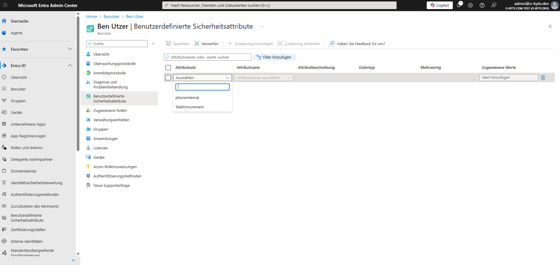 Wähle den entsprechenden Nutzer aus und klicke in der Sidebar links auf "Benutzerdefinierte Sicherheitsattribute".