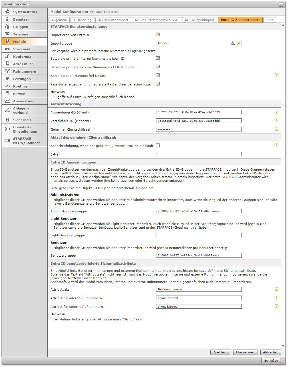 Mit dem Modul “AD User Importer” werden Benutzer ganz einfach aus dem lokalem Active Directory oder aus Entra ID in die STARFACE importiert. Benutzerdaten, wie Telefonnummern, Faxnummern oder E-Mailadresse werden automatisch übertragen. Bestehende Benutzer werden über die regelmäßige Synchronisation aktualisiert. Zusätzlich erspart das Modul den Userimport bei Neuinstallationen.