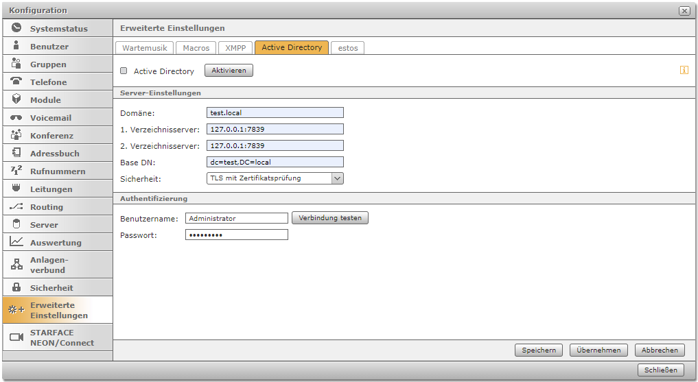 | Der Verzeichnis-Server muss als IP angegeben werden (127.0.0.1:Port), da die DNS-Auflösung der STARFACE auf die “localhost" Anfrage die externe IP-Adresse auflöst. |