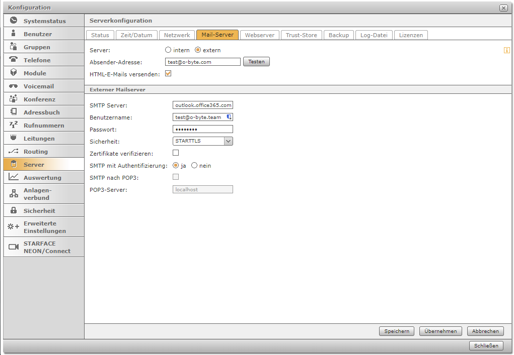 Wenn Fax-Sendebestätigungen per E-Mail erhalten werden sollen, muss vorher der Mailserver in den STARFACE Servereinstellungen wie folgt konfiguriert werden: