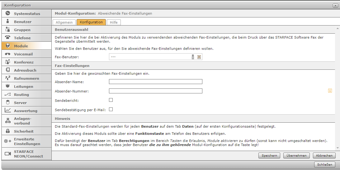 Mit dem Modul „Abweichende Faxeinstellung“ für STARFACE kann eine abweichende Faxkennung gesendet werden, als für einen Benutzer konfiguriert ist. Frei konfigurierbar sind der Absender-Name, die Absender-Nummer, die Einstellungen zum Sendebericht und zur Sendebestätigung.