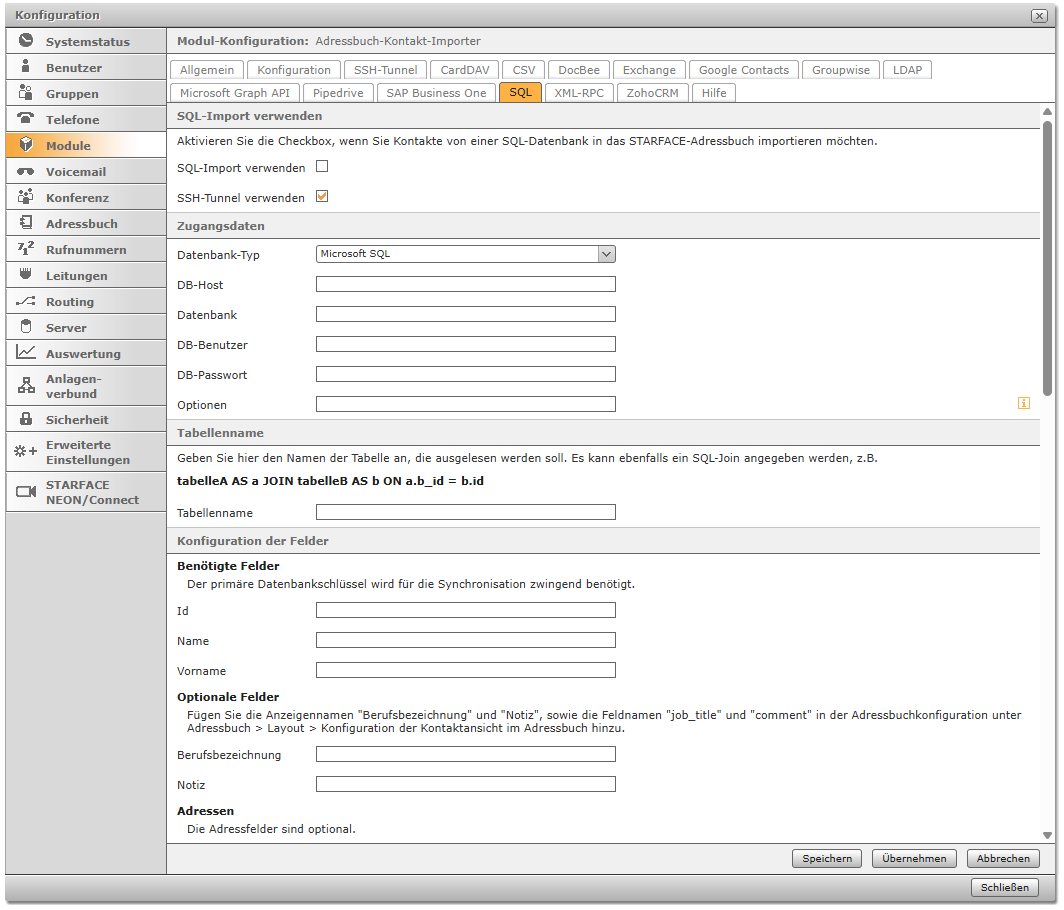 SQL-Server befindet sich im selben Netzwerk wie die STARFACE bzw. ist durch diese erreichbar (z.B SSH-Tunnel nutzen)