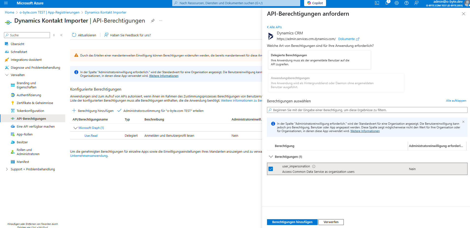 Registriere eine App mit der Berechtigung "DynamicsCRM user_impersonation".