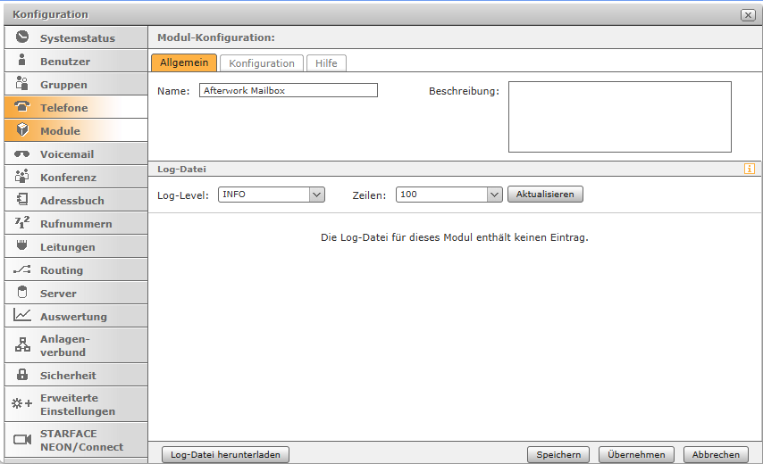 Jedes Modul informiert in den Levels "ERROR, WARN, INFO, DEBUG, TRACE" in den jeweils verschiedenen Abstufungen über Prozesse, die im Modulbetrieb ablaufen. Falls ein Fehler auftritt hat man hier die Möglichkeit, die Logdatei zu speichern. Standardeinstellung ist das Level "INFO".