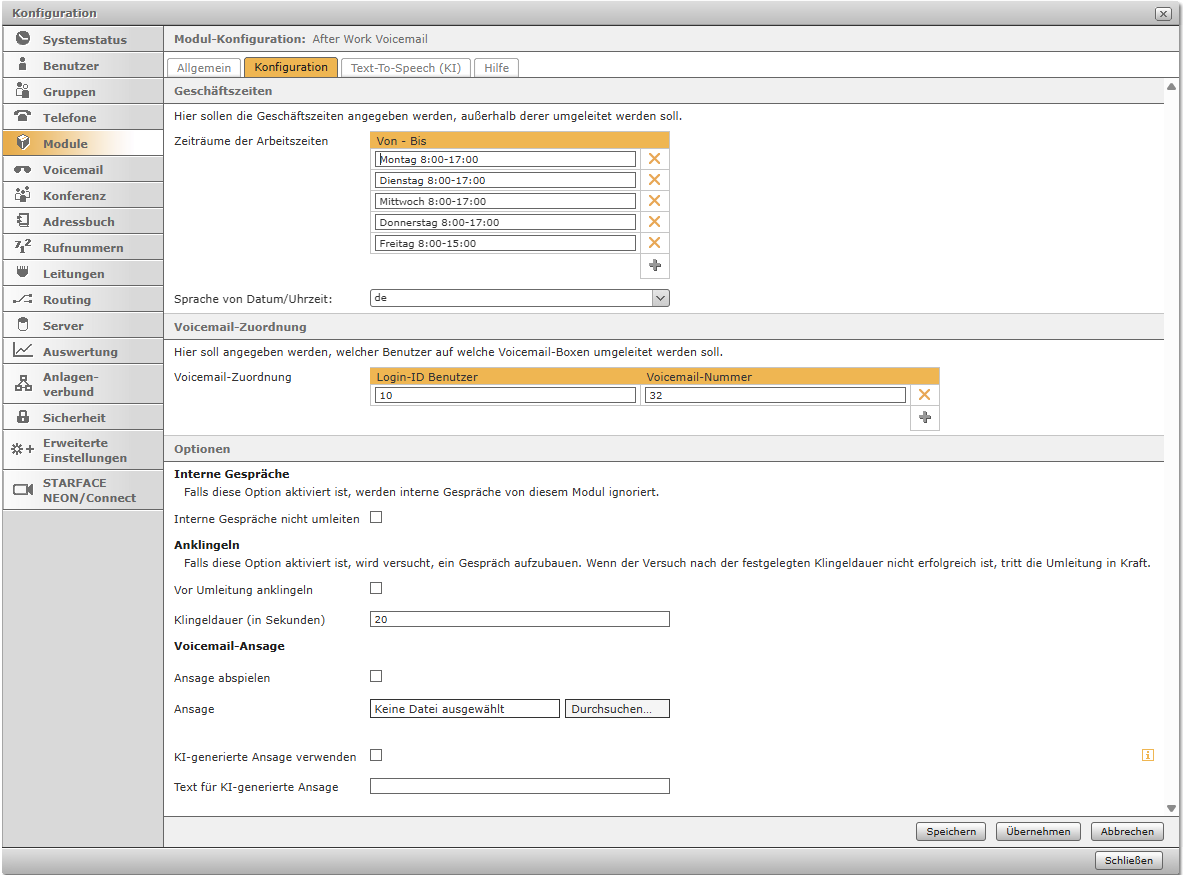 Ein Kunde mit 20 Mitarbeitern hat die Anforderung, dass außerhalb der Geschäftszeiten eine Ansage abgespielt wird, die über die Geschäftszeiten informiert und die Möglichkeit gibt auf die Mailbox des angerufenen Benutzers zu sprechen. Bei dem Standard-Modul "Zeitgesteuerte Umleitung" von STARFACE, würde es für die Abbildung des Szenarios 20 Modul-Konfigurationen benötigen. Mit diesem Modul benötigt es lediglich eine schnelle Modul-Konfiguration.
