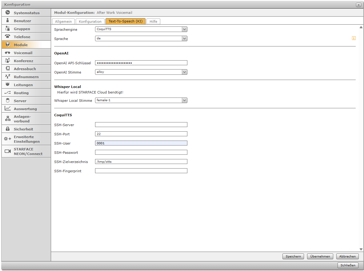 Wähle bei KI-Stimme die Stimme aus, mit der Ansagen generiert werden soll.