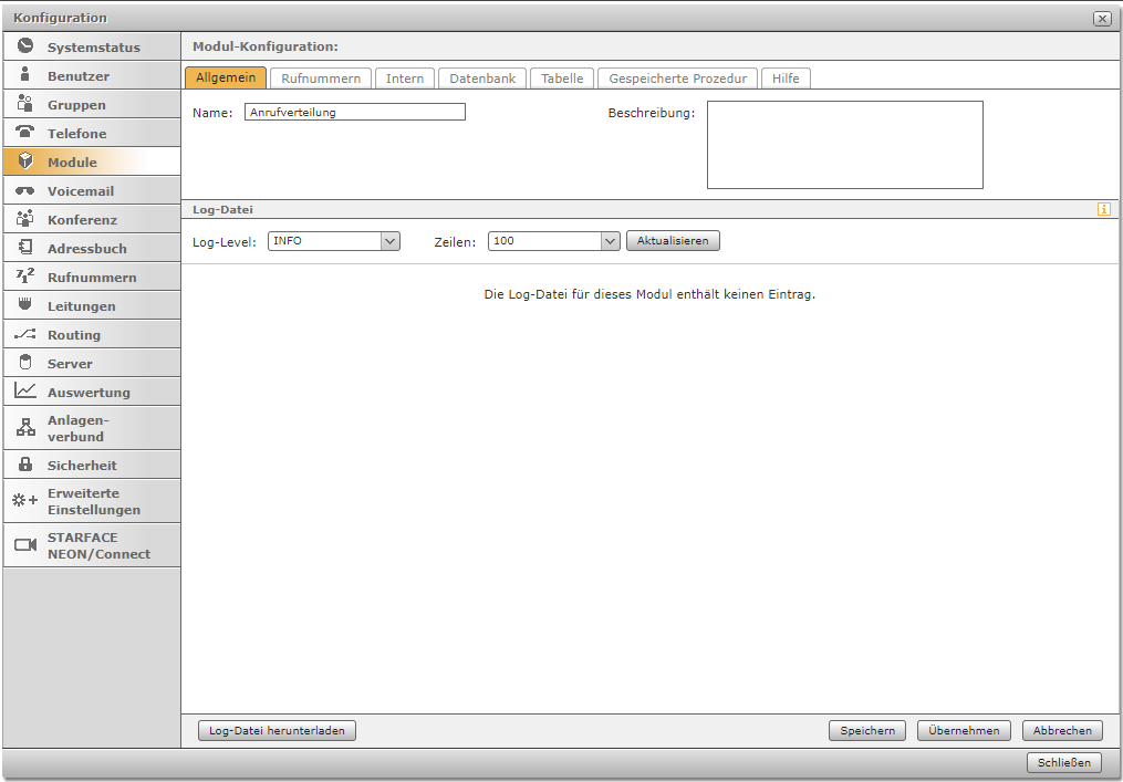 Jedes Modul informiert in den Levels "ERROR, WARN, INFO, DEBUG, TRACE" in den jeweils verschiedenen Abstufungen über Prozesse, die im Modulbetrieb ablaufen. Falls ein Fehler auftritt hat man hier auch die Möglichkeit, die Logdatei zu speichern. Standardeinstellung ist das Level "INFO".
