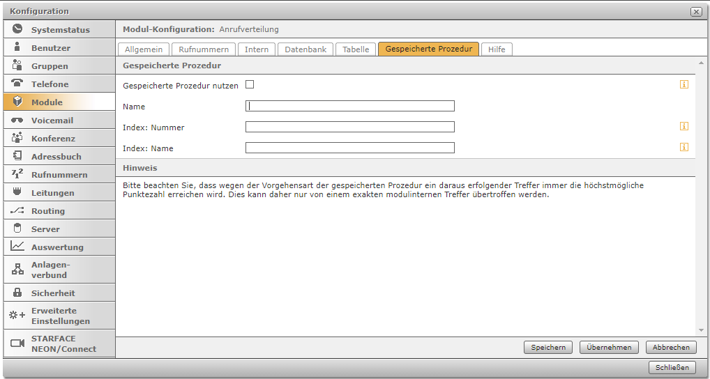 Soll die Konfiguration der Anrufverteilung über eine gespeicherte Prozedur (stored procedure) vorgenommen werden, aktiviere bitte den Modus „Gespeicherte Prozedur nutzen“ über die Checkbox.
