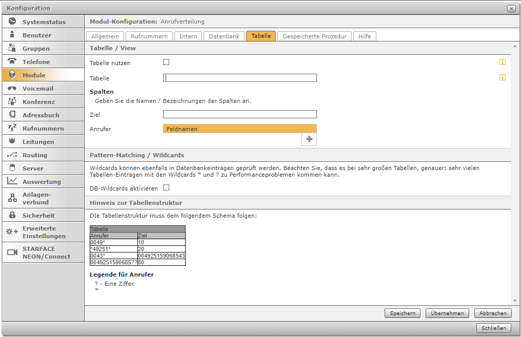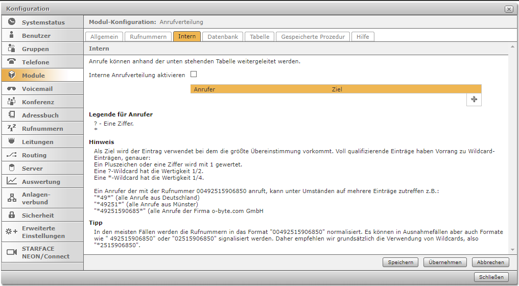 In der folgenden Tabelle wird die Anrufverteilung konfiguriert. Gebe unter "Anrufer" die eingehenden Nummern ein. Als Ziel wird entsprechend die Zielrufnummer für die Quellrufnummer in selbiger Zeile angegeben, dies können sowohl interne als auch externe Nummern sein. Arbeite auch hier wieder mit den STARFACE-spezifischen Platzhaltern „?“ und „*“.
