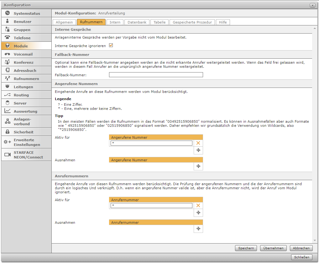 Definiere hier, für welche Rufnummern die Anrufverteilung durchgeführt werden soll. Die STARFACE spezifischen Platzhalter/Wildcards "?" für eine Ziffer oder "*" für mehrere Ziffern können hier ebenfalls benutzt werden.