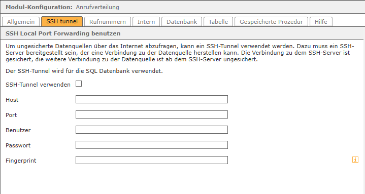 Um das Modul in Verbindung mit einer STARFACE Cloud Anlage sicher nutzen zu können, ist es nötig, die Datenbankverbindung über eine verschlüsselte SSH-Verbindung zu realisieren.