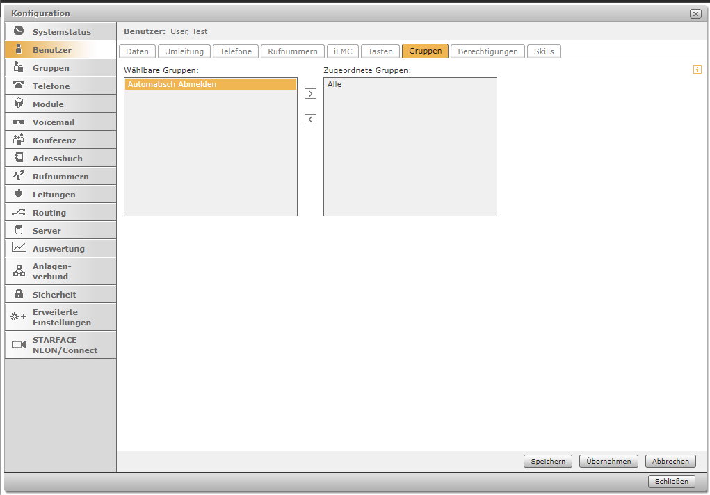 Drücke im Menüpunkt "Gruppen" auf das "+"-Symbol, um eine neue Gruppe zu erstellen. Diese Gruppe wird für alle Benutzer verwendet, die vom Modul automatisch abgemeldet werden sollen.