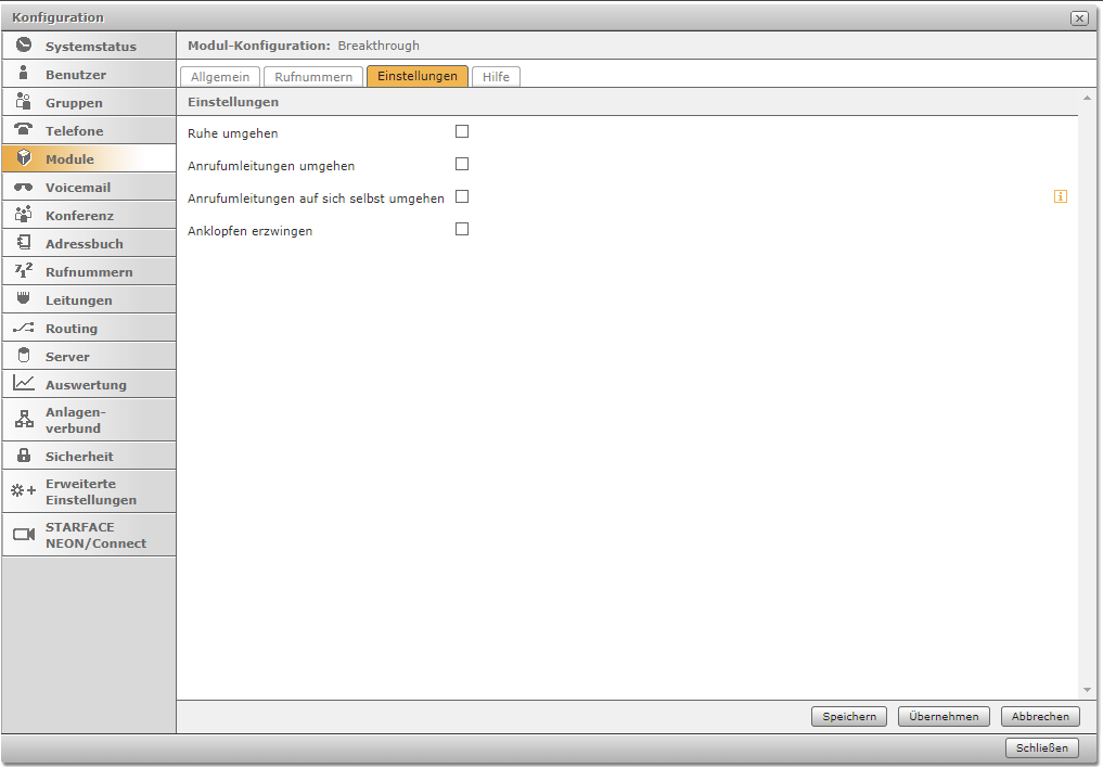 Die Erweiterung "Breakthrough" für STARFACE ermöglicht bestimmten Anrufern, den Modus „Nicht stören“ (DND) oder eine Rufumleitung zu durchbrechen. Zudem kann die Funktion „Anklopfen“ erzwungen werden.