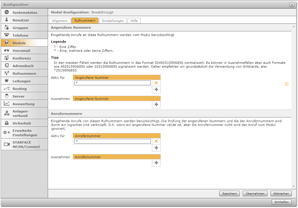 Definiere hier die Ausnahmen für die "Aktiv für" Regel. Wurde mit Wildcards ein Nummernbereich definiert, kann man hier einzelne oder mehrere Nummern von der Regel ausnehmen.
