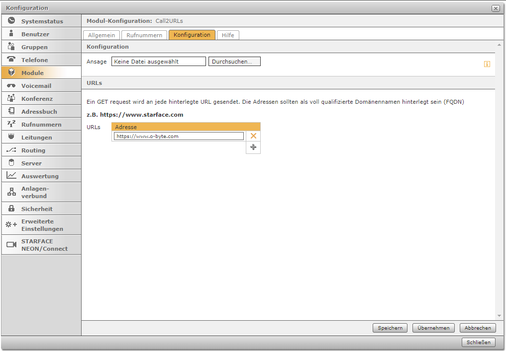 Trage hier die URLs ein, an die bei einem eingehenden Anruf ein GET-Request gesendet werden soll. Die Adressen sollten als voll qualifizierte Domänennamen hinterlegt sein (FQDN).