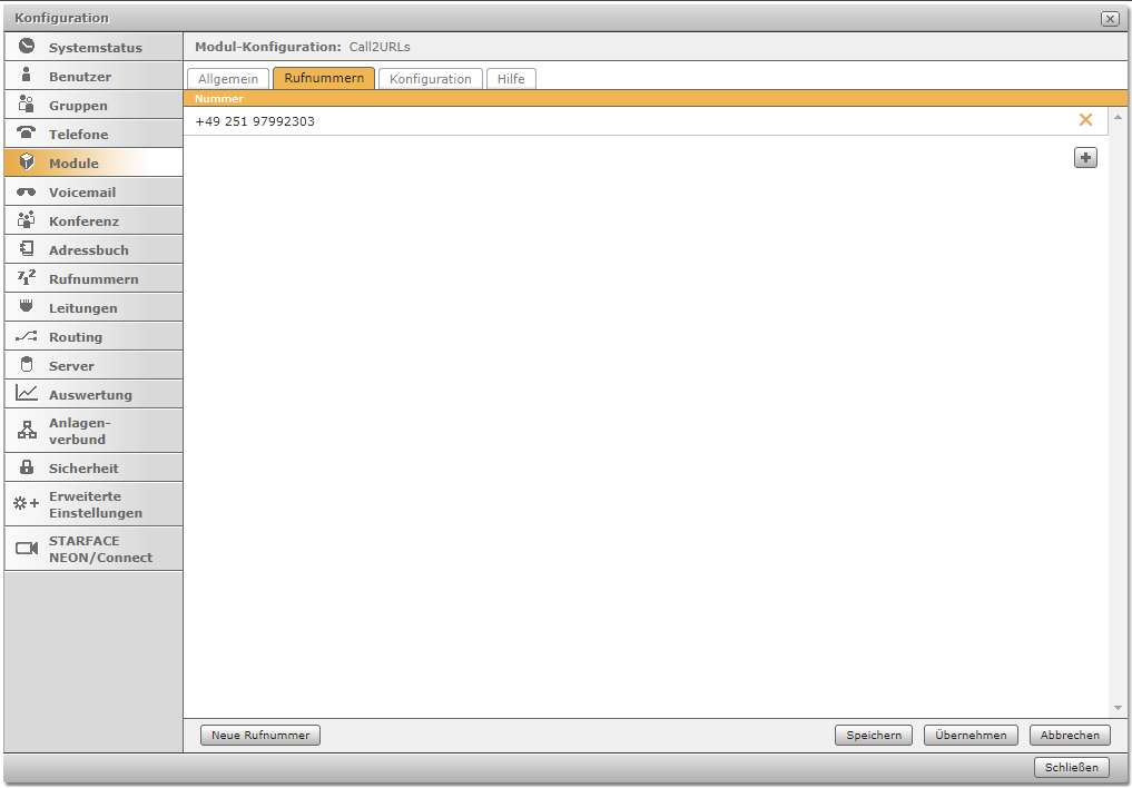 Vergib hier über die "+"-Schaltfläche die Rufnummer(n), auf die das Modul reagieren soll. Es können hier sowohl anlageninterne, als auch externe Nummern vergeben werden. Die hier vergebenen Nummern können keinem anderen Nutzer, Gruppe oder Modul zugewiesen werden.