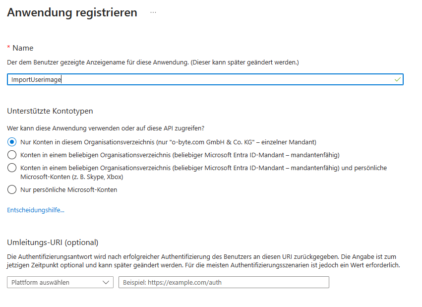 Vergebe einen Namen für die App (Bspw. „Entra ID Photo Sync“) und wähle bei „Unterstütze Kontotypen“: Nur Konten in diesem Organisationsverzeichnis.