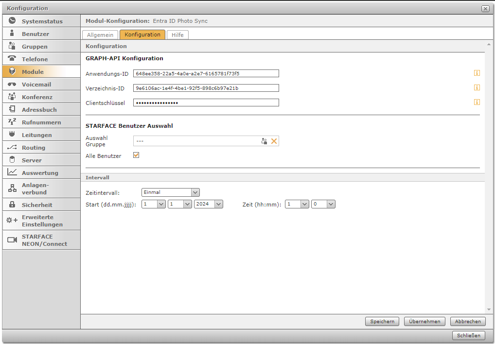 Füge die bei der Graph-API App erzeugten Schlüssel (Anwendungs-ID, Verzeichnis-ID, Clientschlüssel) in das Modul ein.
