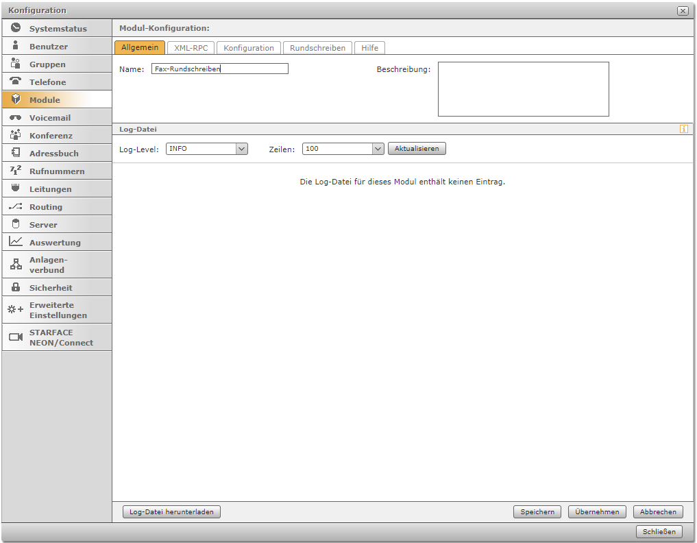 Jedes Modul informiert in den Levels "ERROR, WARN, INFO, DEBUG, TRACE" in den jeweils verschiedenen Abstufungen über Prozesse, die im Modulbetrieb ablaufen. Falls ein Fehler auftritt hat man hier die Möglichkeit, die Logdatei zu speichern. Standardeinstellung ist das Level "INFO".