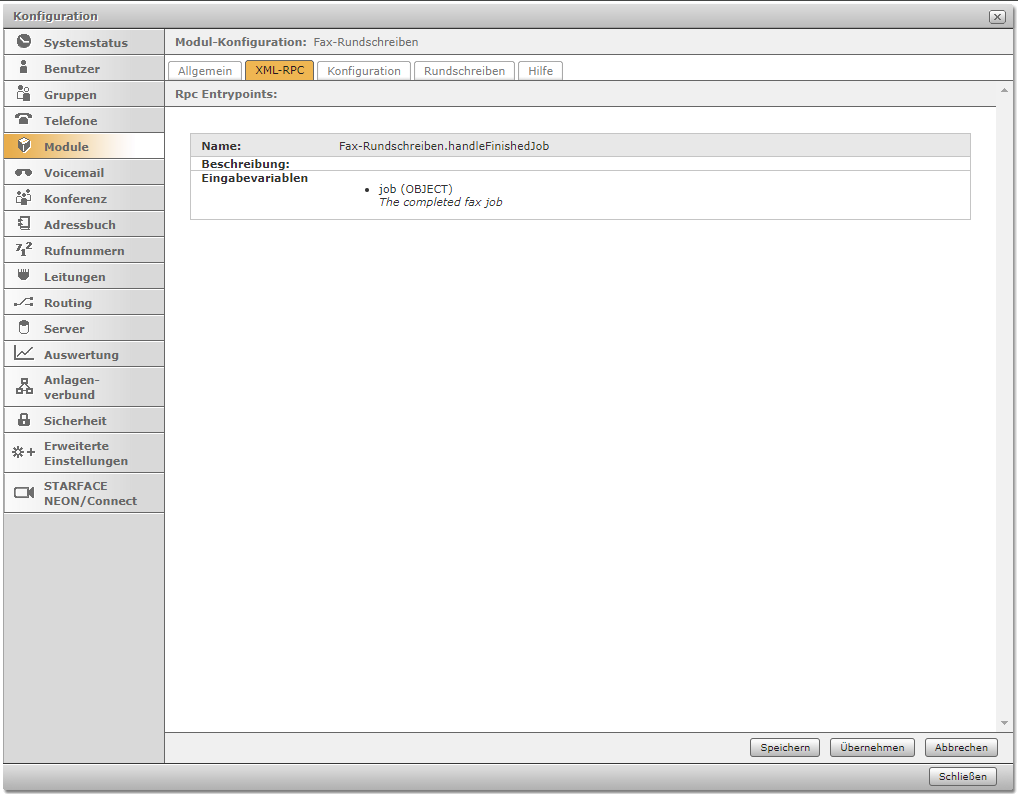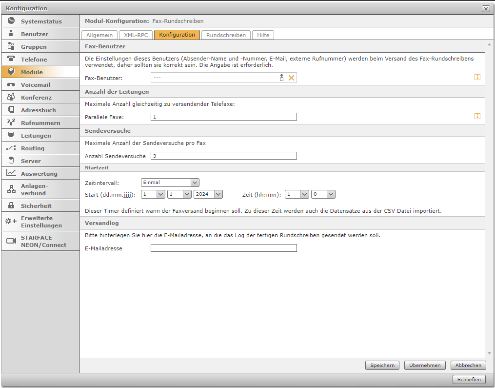 Es sind nicht nur Administrationsrechte auf der STARFACE für die Konfiguration des Moduls nötig. Zur Nutzung als normaler Benutzer des Moduls benötigt dieser das Admin-Recht „Module“. Andernfalls ist kein Zugriff für den Benutzer auf das Modul möglich und somit kann kein Versand konfiguriert werden.