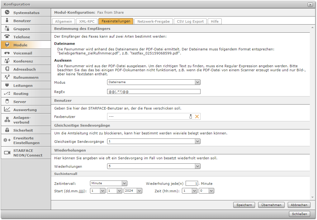 Definiere unter "Faxbenutzer" den STARFACE Benutzer, durch den die Faxe vom Modul versendet werden sollen.
