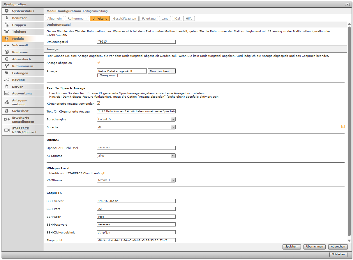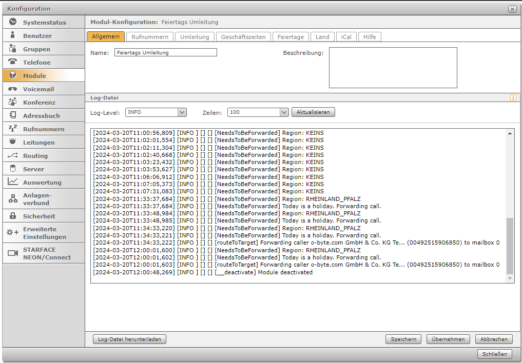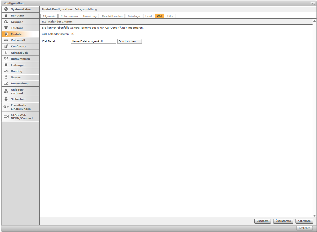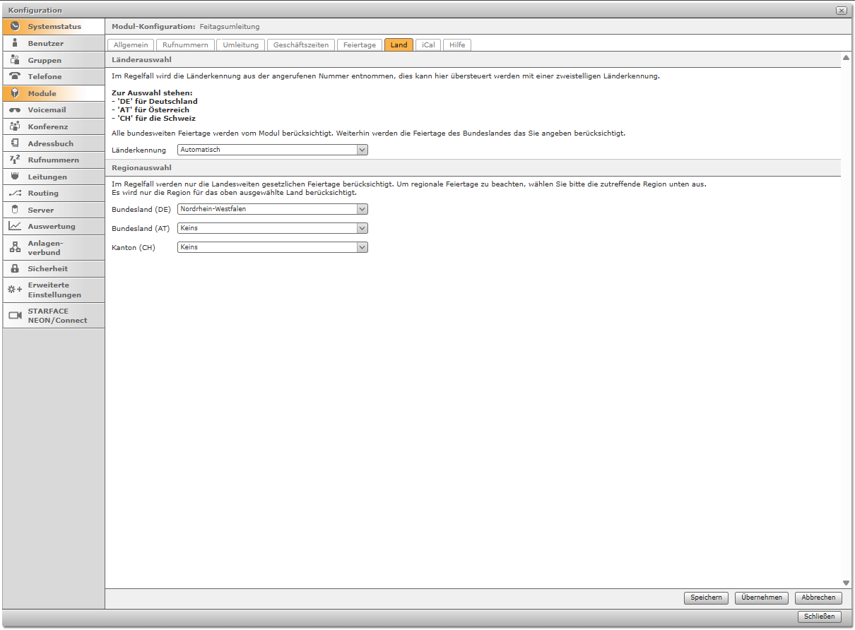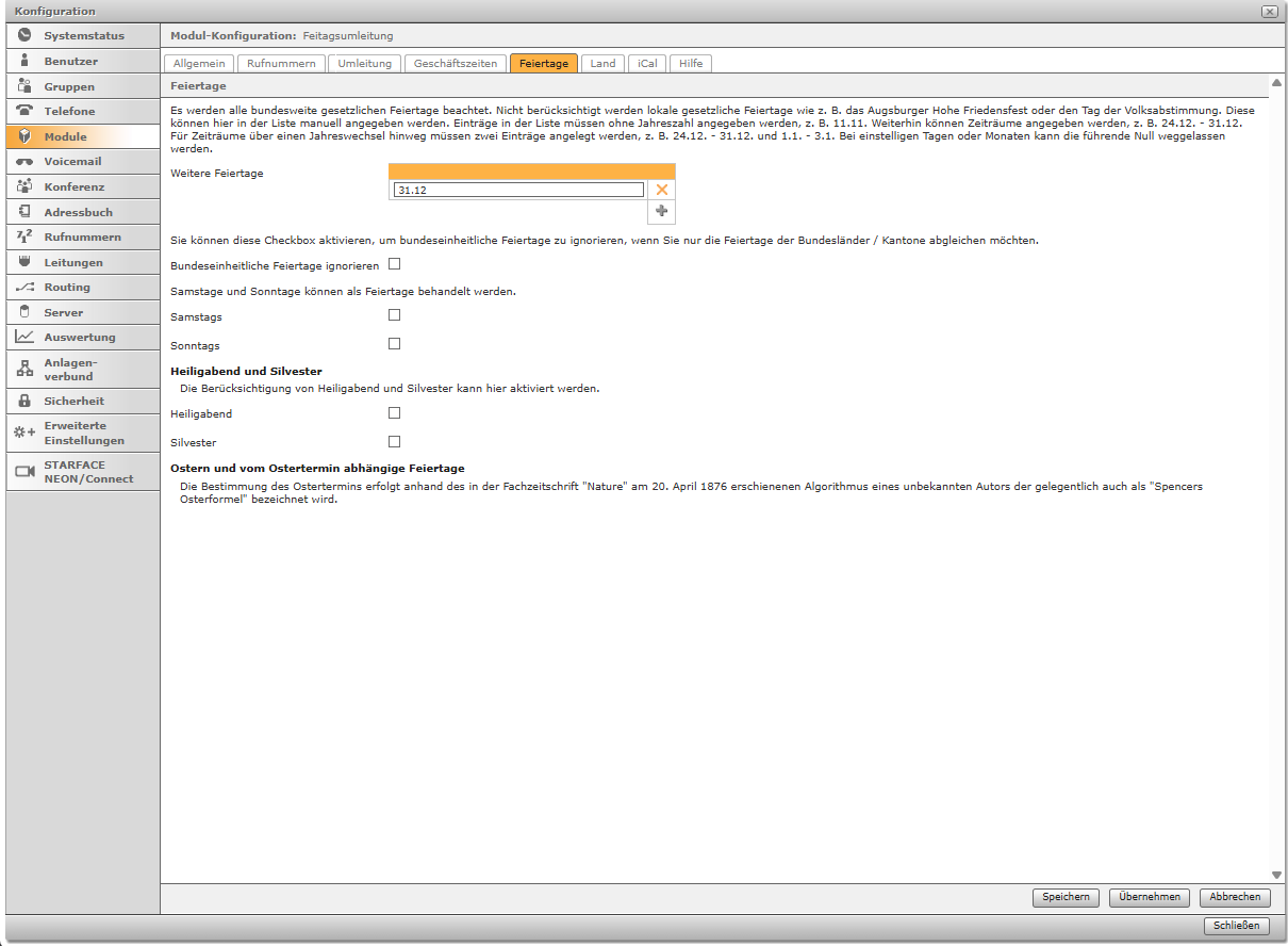 Das STARFACE Modul „Feiertagsumleitung“ leitet eingehende Anrufe an Feiertagen mit optionaler Ansage auf eine interne/externe Rufnummer oder Mailbox automatisiert um. Wahlweise kann im Modul eine individuelle Ansage KI-generiert werden. In dem Modul sind bereits alle gesetzlichen Feiertage integriert und können nach Bundesland selektiert werden. Zusätzlich können weitere (örtlich spezifische) Feiertage manuell konfiguriert oder mittels Upload eine iCal-Datei (.ics) definiert werden.