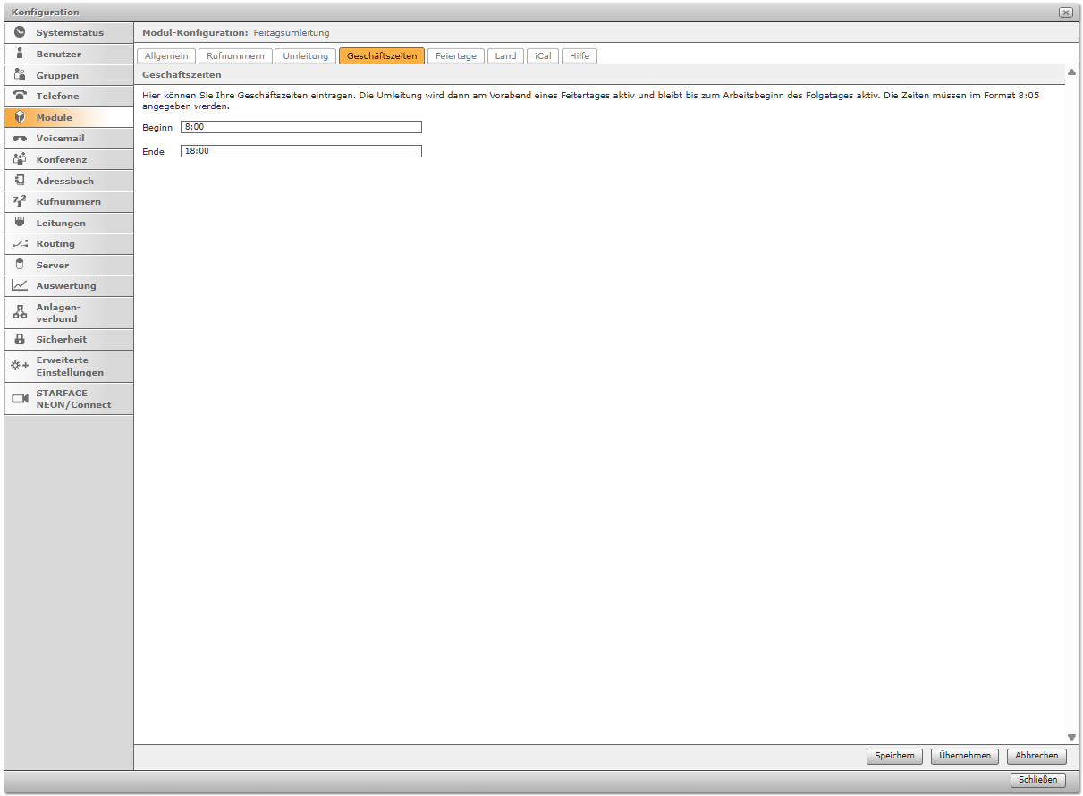 Hier können die Geschäftszeiten eingetragen werden. Die Umleitung wird dann am Vorabend eines Feiertages aktiviert und bleibt bis zum Arbeitsbeginn des Folgetages aktiv. Die Zeiten müssen im Format hh:mm ohne führende Nullen bei den Stunden (zum Beispiel: 8:05) angegeben werden.