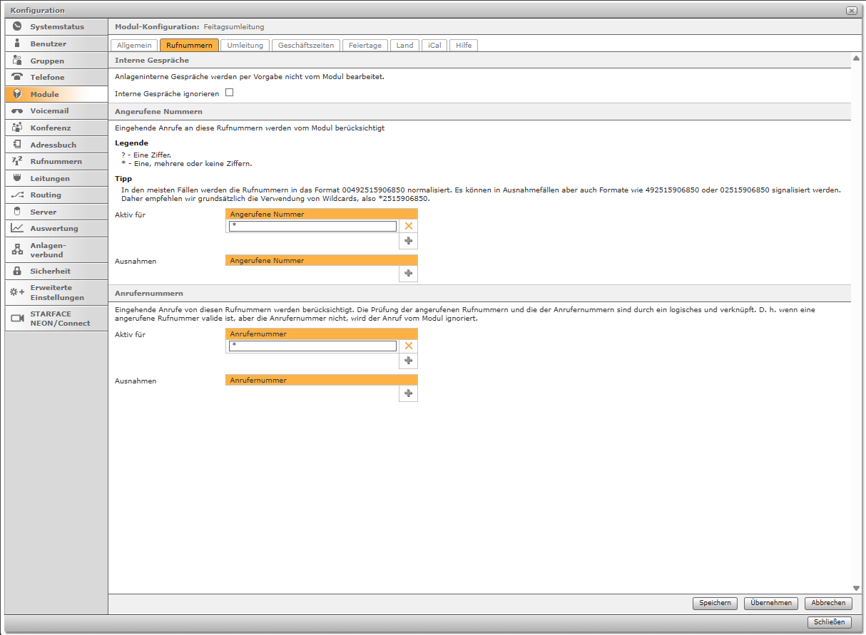 Definiere hier, für welche Zielrufnummern die Feiertagsumleitung durchgeführt werden soll. Es kann mit den STARFACE spezifischen Platzhaltern „?“ und „*“ gearbeitet werden. Trage unter „Aktiv für“ die Nummern ein, für die die Umleitung greifen soll. Definiere unter Ausnahmen Zielrufnummern, die von der Umleitung nicht berücksichtigt werden sollen. Letztgenannter Punkt wird wichtig, wenn sich zum Beispiel eine Durchwahl mit der Konfiguration für „Aktiv für“ überschneidet, insbesondere wenn mit Platzhaltern gearbeitet wurde.
