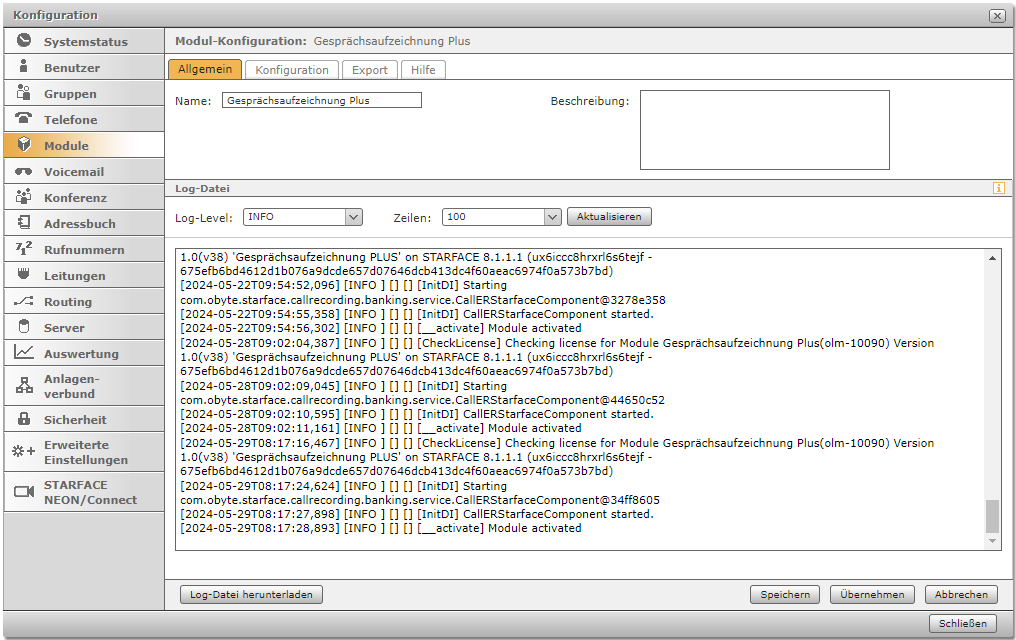Jedes Modul informiert in den Leveln "ERROR, WARN, INFO, DEBUG, TRACE" in den jeweils verschiedenen Abstufungen über Prozesse, die im Modulbetrieb ablaufen. Falls ein Fehler auftritt hat man hier die Möglichkeit, die Logdatei zu speichern. Standardeinstellung ist das Level "INFO".