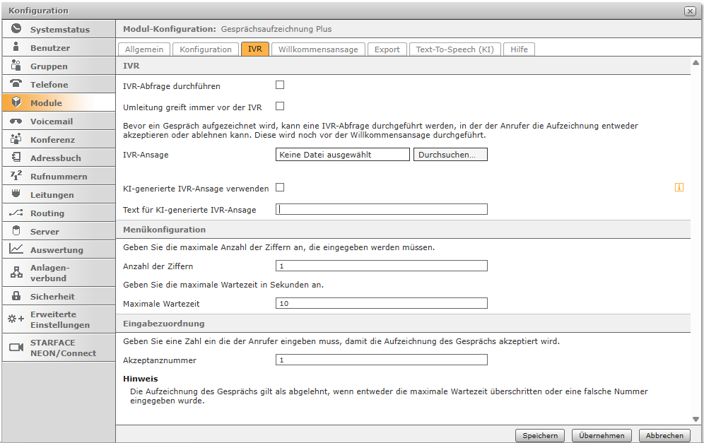 Aktiviere die Checkbox, um die IVR-Funktion des Moduls zu aktivieren.