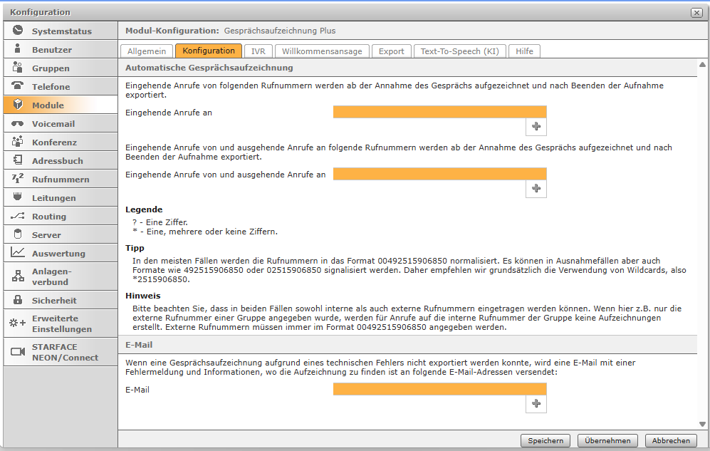 Hier können Rufnummern im Format 004925215906850 hinterlegt werden, für die eingehende und ausgehende Anrufe ab der Annahme des Gesprächs aufgezeichnet und nach Beenden der Aufnahme exportiert werden. Rufnummern können hier auch mittels Wildcards definiert werden.