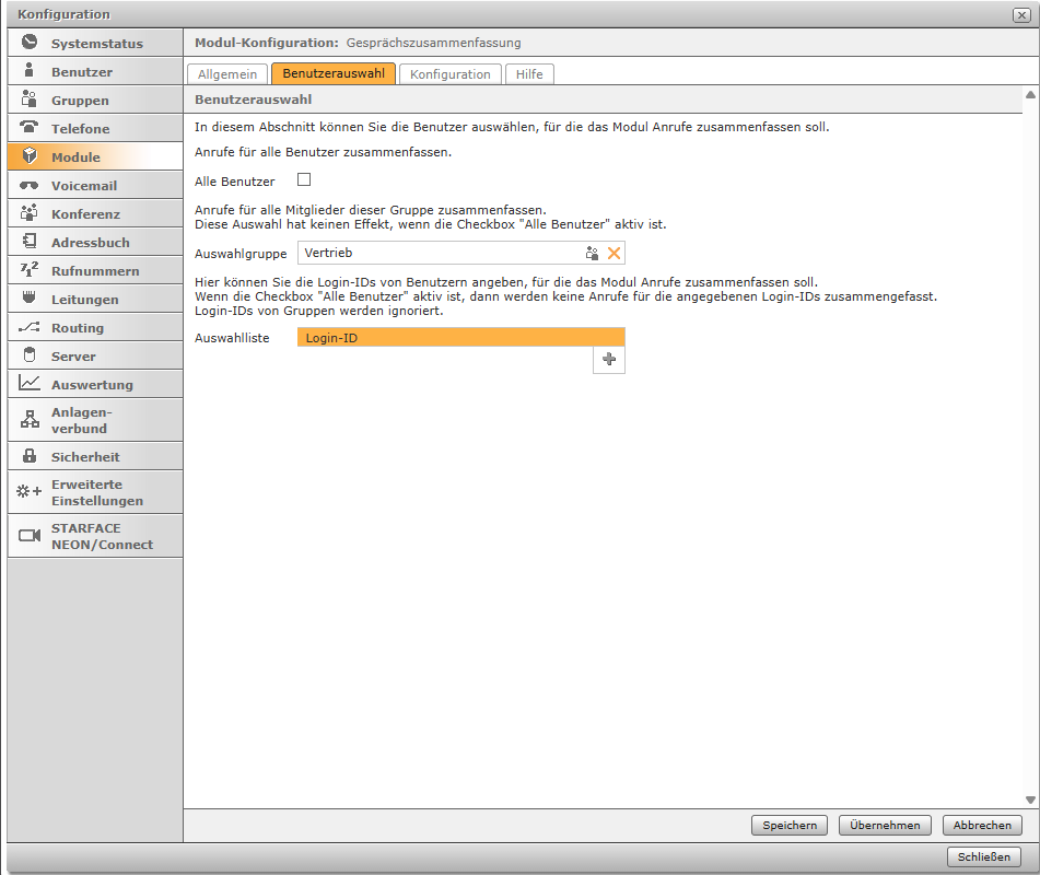 In diesem Abschnitt wird festgelegt, für welche Benutzer das Modul die Gespräche zusammenfassen soll.