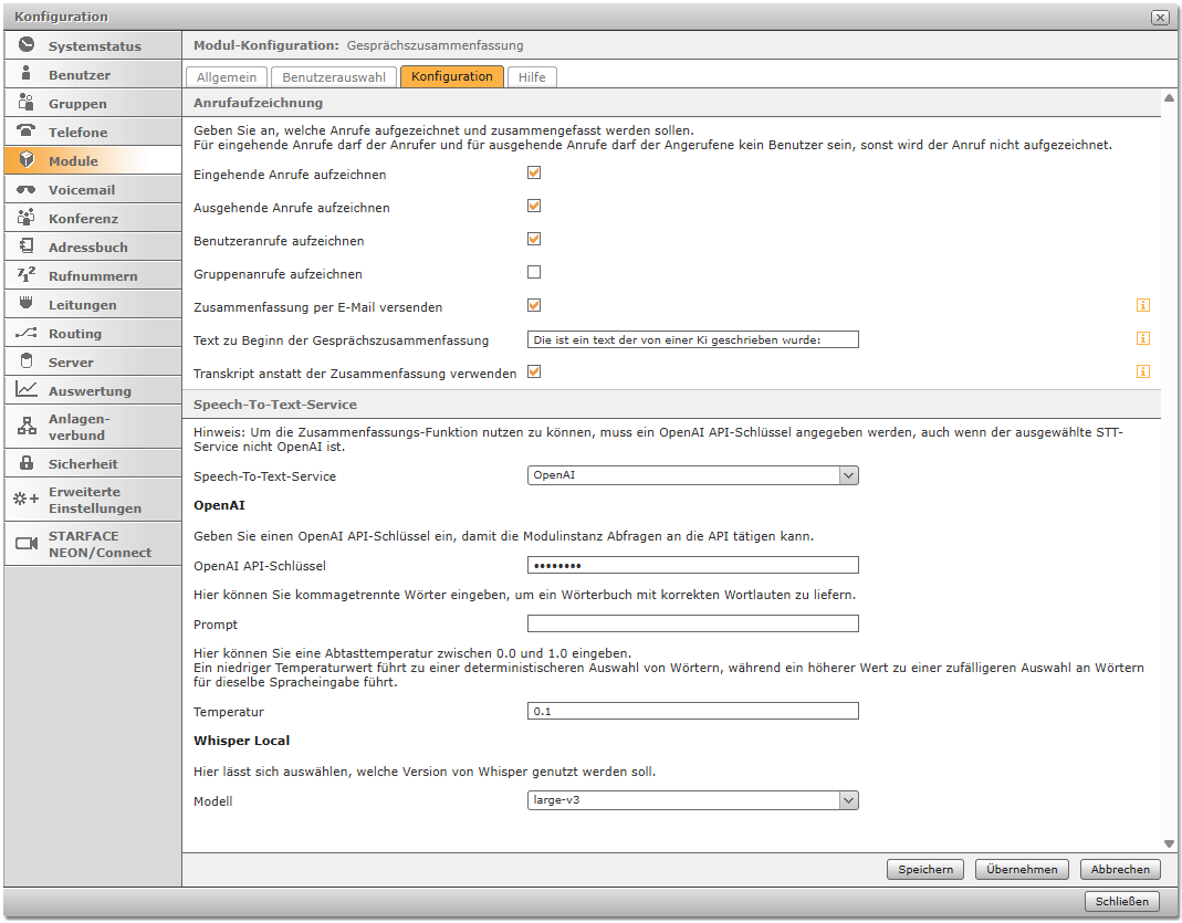 Das Modul zeichnet Telefongespräche auf und fasst diese mit Hilfe von OpenAI in Textform zusammen. Diese Zusammenfassung wird als Kommentar in den Anrufeinträgen der Benutzer gespeichert und kann optional per E-Mail an diese verschickt werden. Die Zusammenfassung kann bei Bedarf manuell geändert werden.
