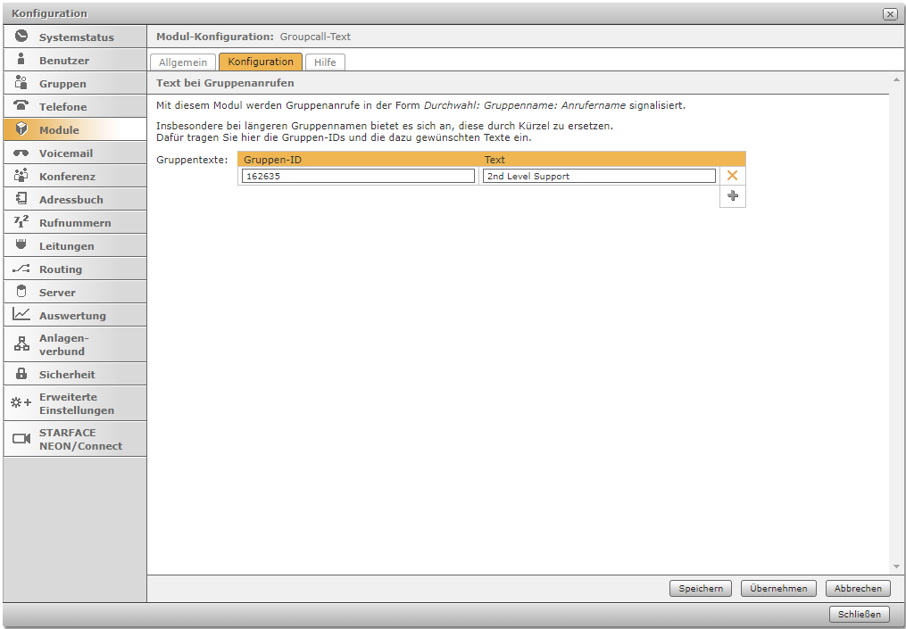 Mit diesem Modul werden Gruppenanrufe in der Form Durchwahl: Gruppenname: Anrufername signalisiert. Insbesondere bei längeren Gruppennamen bietet es sich an, diese durch Kürzel zu ersetzen. Trage dazu hier tabellarisch die Gruppen und den jeweils gewünschten Text ein. Bitte beachte, dass die Gruppen-ID und nicht die interne Durchwahl anzugeben ist.