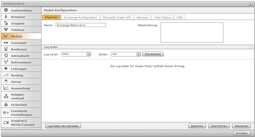 Jedes Modul informiert in den Levels "ERROR, WARN, INFO, DEBUG, TRACE" in den jeweils verschiedenen Abstufungen über Prozesse, die im Modulbetrieb ablaufen. Falls ein Fehler auftritt hat man hier die Möglichkeit, die Logdatei zu speichern. Standardeinstellung ist das Level "INFO".