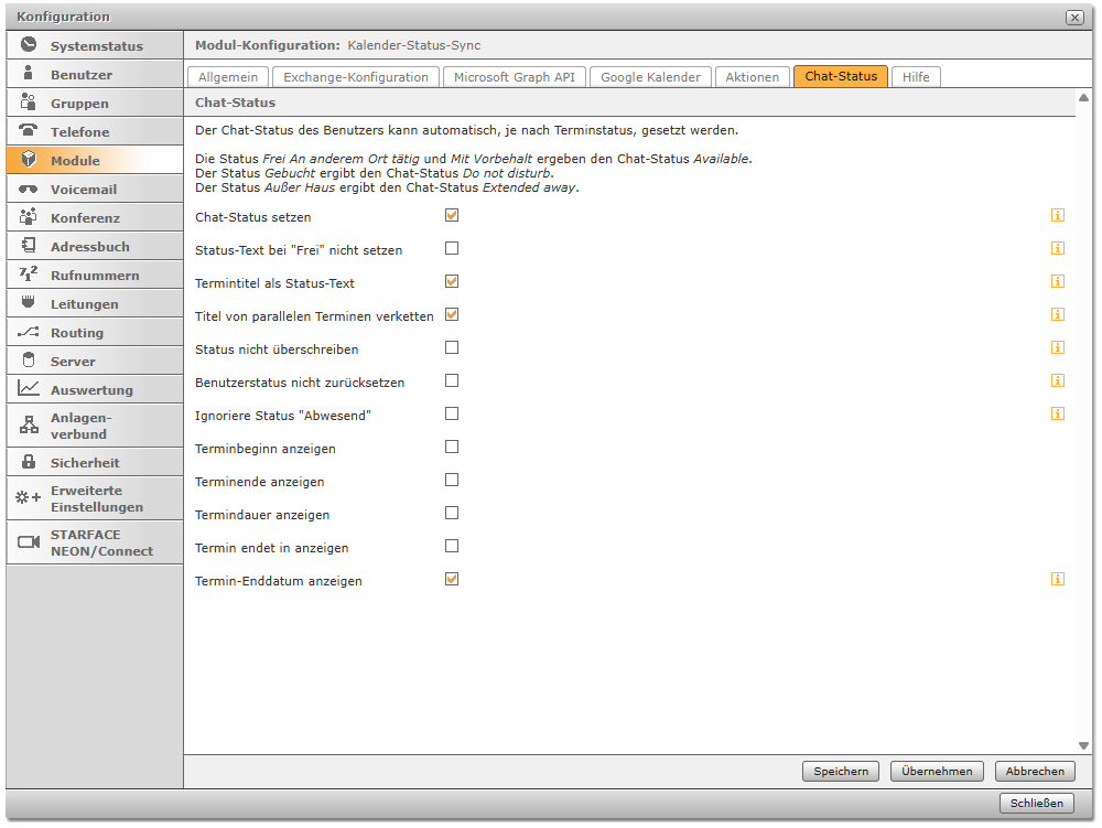 Dieses Modul realisiert die Synchronisation des Outlook oder Google Kalenders in das STARFACE System. Termintitel können in die BLF Taste Synchronisiert werden. Andere Nutzer können abschätzen, wie lange der jeweilig andere Nutzer vorraussichtlich nicht erreichbar ist. Ein weiterer Nutzungsschwerpunkt ist das automatisieren der erreichbarkeiten vom Nutzer selber, sodass der Erreichbarkeitsstatus nicht manuell gesetzt werden muss.
