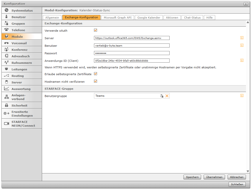 Hinweis: Wenn die Mailadressen der STARFACE Nutzer geändert werden, oder Personenzuordnungen in der Gruppe, müssen die Nutzer neu gecacht werden vom Modul. Dafür ist ein Neustart der Instanz nötig.
