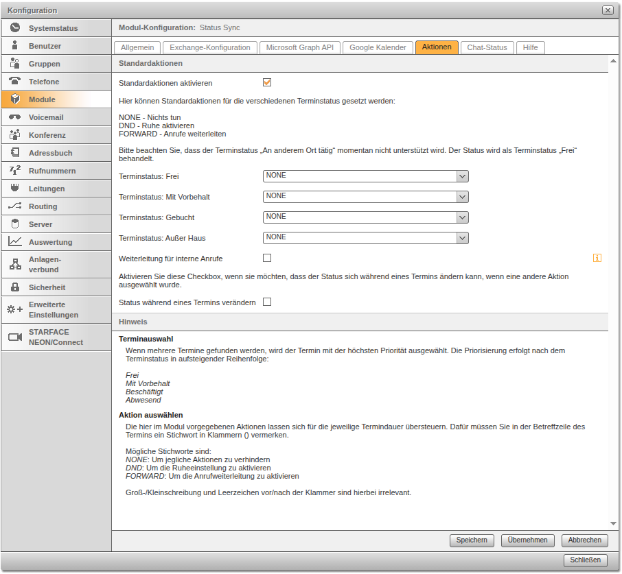 Ist die Aktion “Status nicht überschreiben” aktiviert, ist das Modul führend und Nutzer können ihren Status nicht von Hand im Client setzen. Bleibt diese Option deaktiviert, wird der Status entsprechend dem Kalender neu als “verfügbar” oder “Nicht verfügbar” (tritt bei der Abmeldung auf) gesetzt.