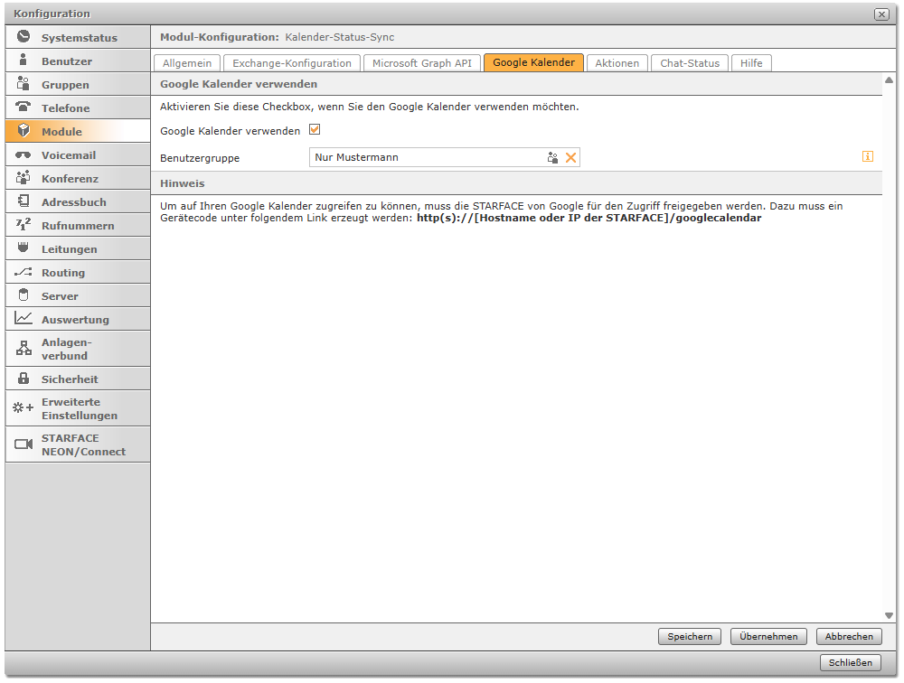 Rufe den Link nach dem Schema "http(s)://[Hostname oder IP der STARFACE]/googlecalendar" auf.