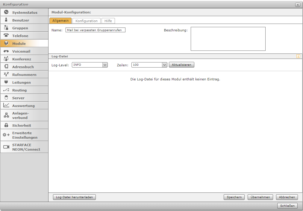 Jedes Modul informiert in den Leveln "ERROR, WARN, INFO, DEBUG, TRACE" in den jeweils verschiedenen Abstufungen über Prozesse, die im Modulbetrieb ablaufen. Falls ein Fehler auftritt hat man hier die Möglichkeit, die Logdatei zu speichern. Standardeinstellung ist das Level "INFO".