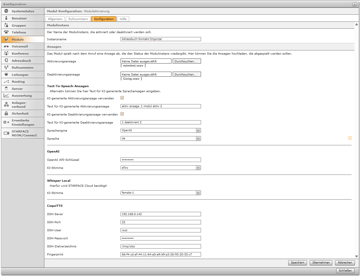 Hier können individuelle Ansagen für das erfolgreiche Aktivieren oder Deaktivieren von Modulen hochgeladen werden.