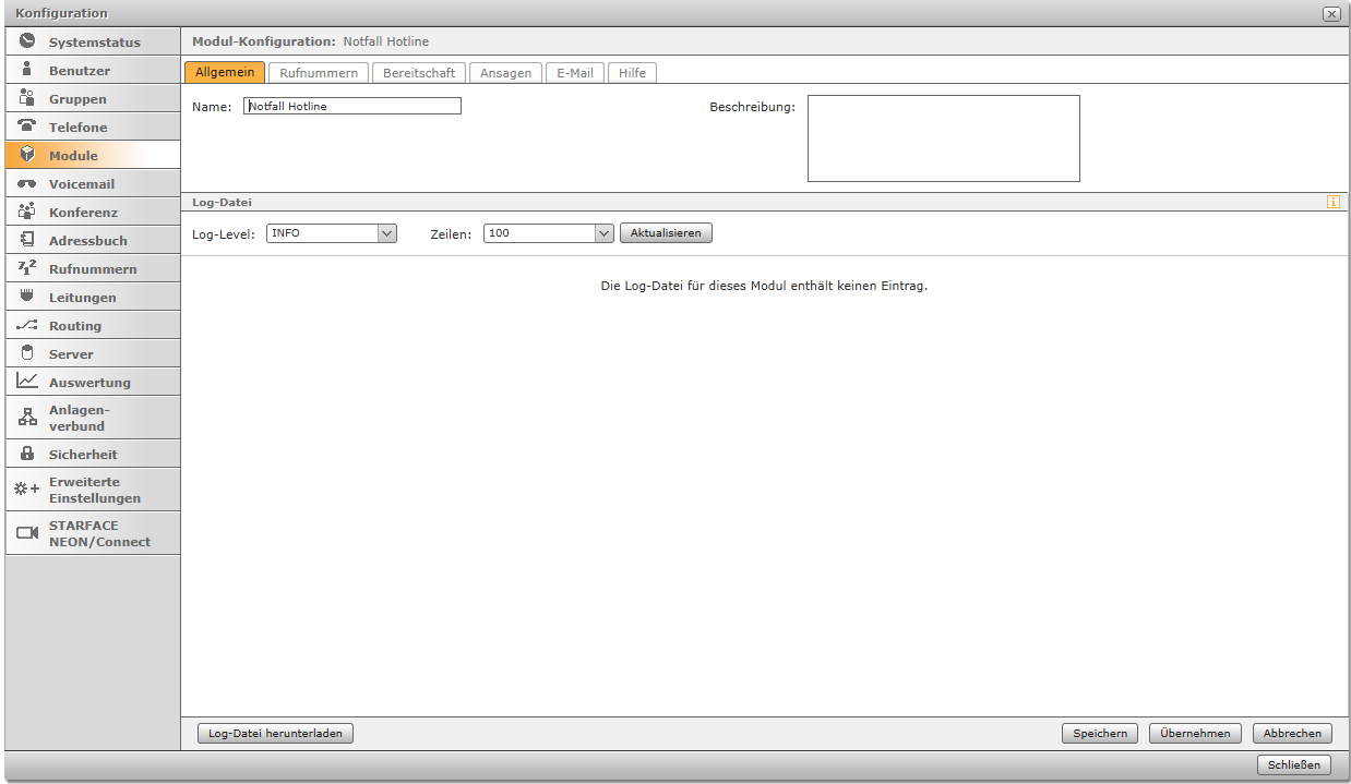 Jedes Modul informiert in den Levels "ERROR, WARN, INFO, DEBUG, TRACE" in den jeweils verschiedenen Abstufungen über Prozesse, die im Modulbetrieb ablaufen. Falls ein Fehler auftritt hat man hier die Möglichkeit, die Logdatei zu speichern. Standardeinstellung ist das Level "INFO".