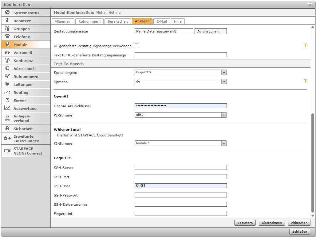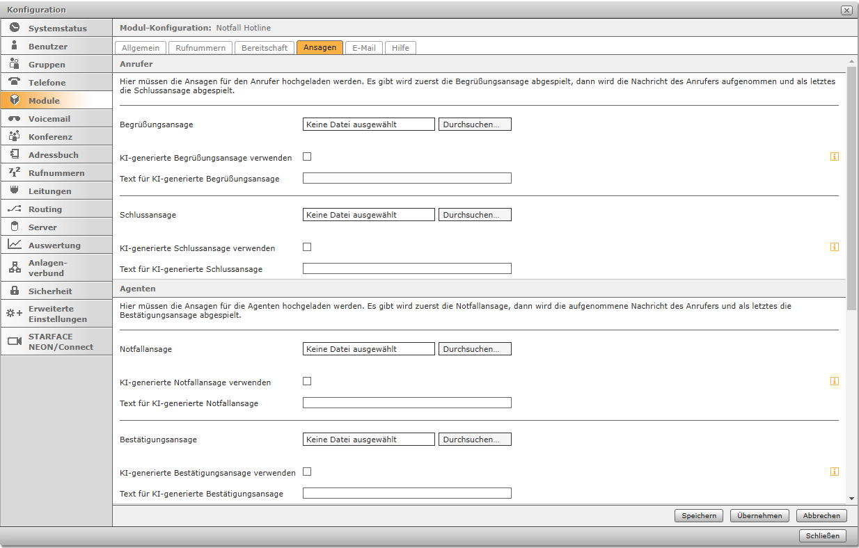 Hier werden die Ansagen festgelegt, die der Anrufer abgespielt bekommt. Hierzu wird entweder eine Audiodatei (.wav) ausgewählt oder mit aktivierter "KI-generierte Ansage verwenden"-Checkbox ein Text mittels Sprachsynthese zu einer Ansage verarbeitet.