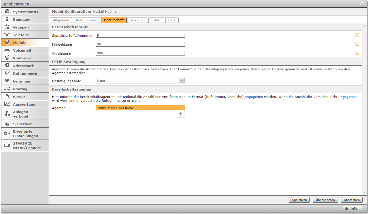 Bestätigungscode: Lege eine Taste fest, über die der Agent den Empfang der Nachricht per DTMF bestätigen kann. Ist keine Bestätigung erforderlich (also "none"), gilt der Anruf als erledigt, sobald der erste Agent den Anruf entgegennimmt. Bei erforderlicher Bestätigung wird das Modul die Klingelstrategie weiter verfolgen, auch wenn der Anruf entgegengenommen wurde, ohne dass er bestätigt wurde.