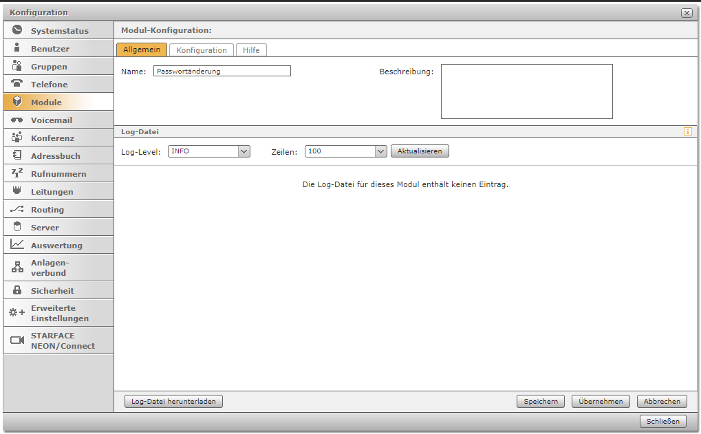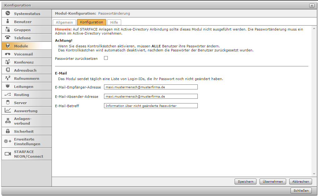 | Auf einer STARFACE Anlage mit Active-Directory Anbindung sollte dieses Modul nicht ausgeführt werden. Die Passwortänderung muss dann von einem Admin im Active-Directory vorgenommen werden. |