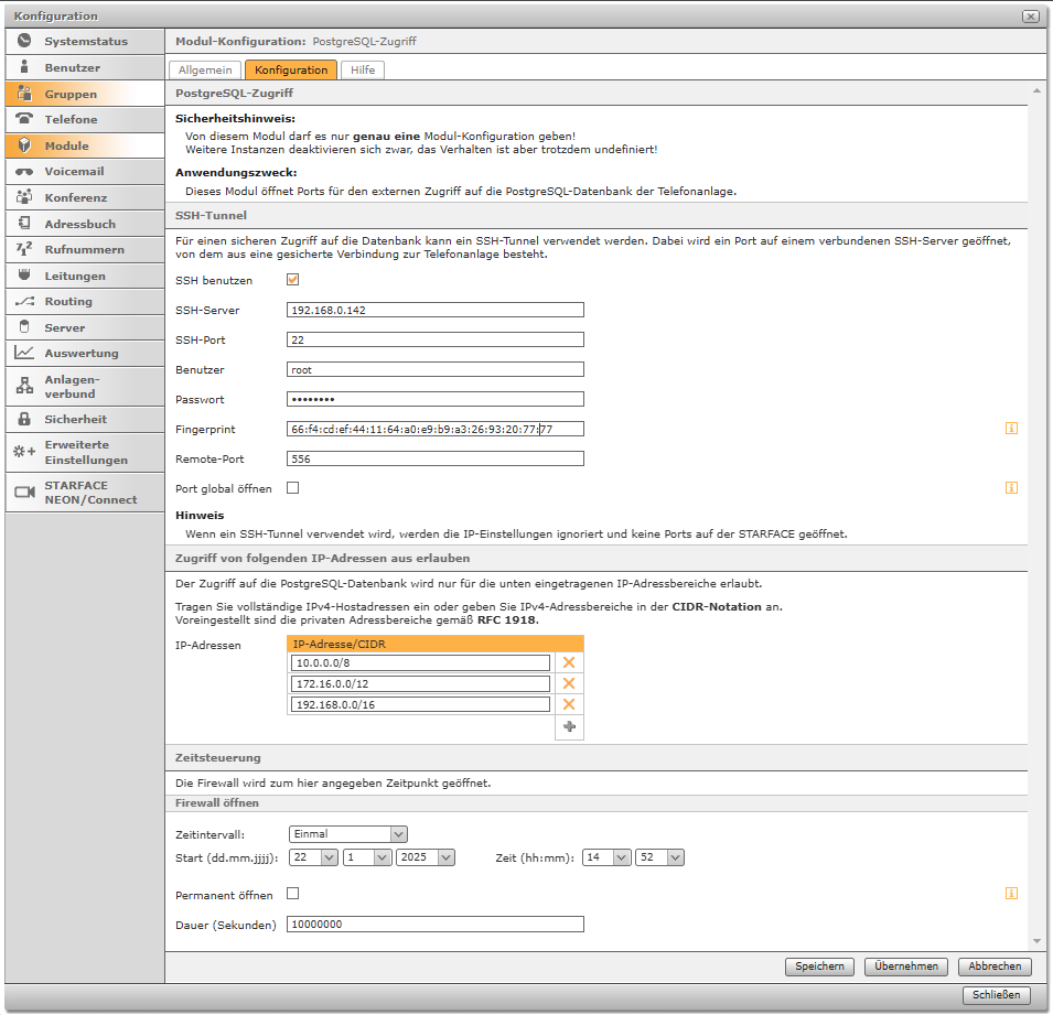Aktiviere diese Checkbox um einen SSH-Tunnel zu verwenden. Bei aktivierter Chechbox werden die IP-Einstellungen ignoriert und keine Ports auf der STARFACE geöffnet.